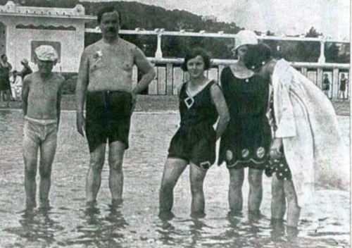 A balatonalmádi strand 1920-ban. Jellegzetes a kor fürdőviselete: a hölgyeknél a lábat is megmutogató nadrágok megrövidültek.